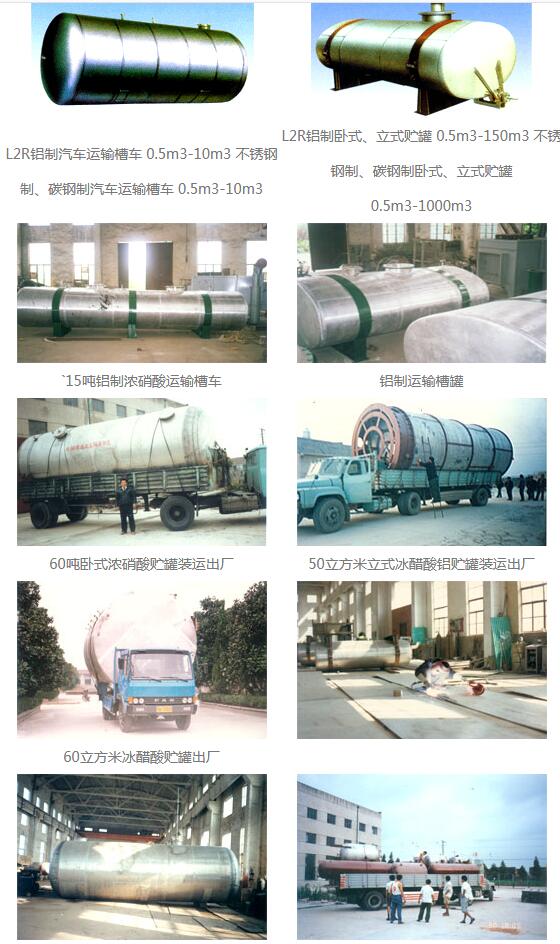工业纯铝板制汽车运输槽车、卧式、立式贮罐、高位槽。(主要用于贮运浓硝酸、冰醋酸等腐蚀液体)不锈钢、碳钢制各种汽车运输槽车,卧式、立式贮槽,高位槽计量槽。其他规格可按用户需求设计、制造。
