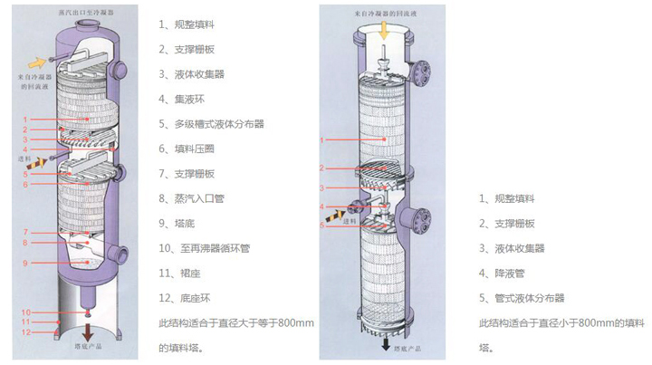 规整填料塔的分离性能取决于内件,即填料、分布器、收集器等。同时也取决于许多参数,如气体负荷、液体负荷、物料性质、操作压力、填料湿润性能和液体分布不均匀等等。至今不能由填料的几何形状来准确计算塔的分离性能,需要通过填料塔的理论和不同条件下通过试验塔来测定准确数据。用户可根据资料以近似程度确定塔的尺寸和需要的填料高度。如果需要经济、合理的结构形式,我厂愿与用户密切合作。